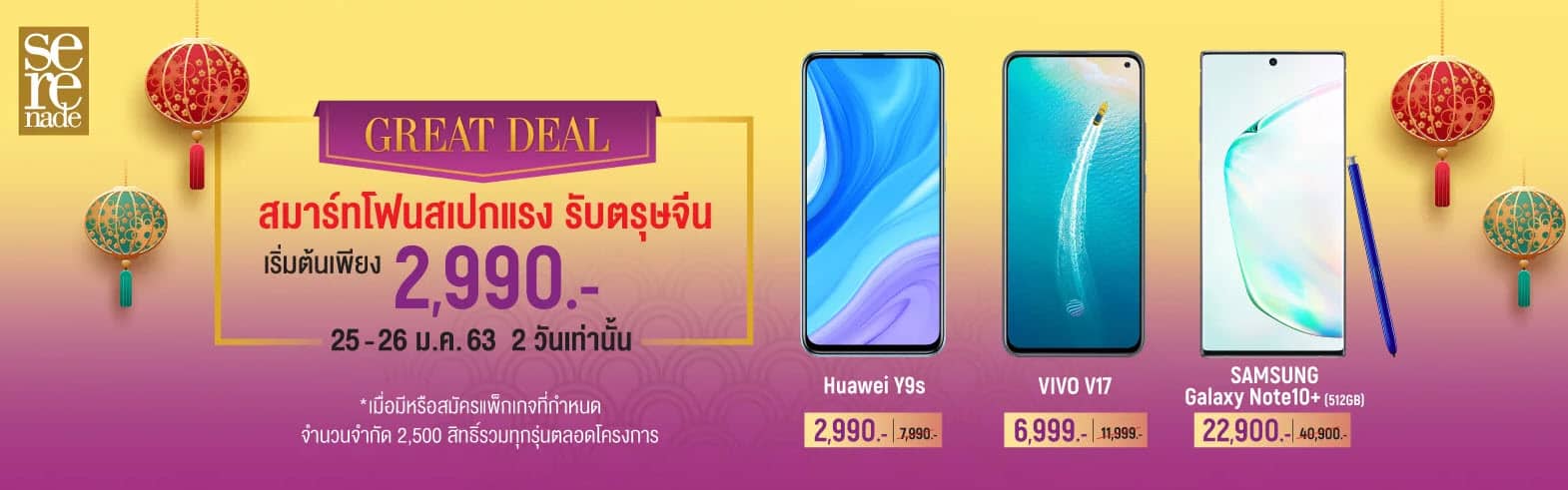 ล่าสุด! สานต่อสิทธิพิเศษปีนี้กับโครงการ “Serenade Great Deal” เริ่มดีลแรกตรุษจีน 2563 เอาใจลูกค้าเซเรเนด เพียงใช้ AIS Points 200 พอยท์ แลกรับส่วนลดสมาร์ทโฟนได้สูงสุด 18,000 บาท พร้อมขยายการรับสิทธิ์จากเดิม 1 วัน เป็น 2 วัน ทุกวันเสาร์-อาทิตย์ที่ 3 ของเดือน ให้ลูกค้าเซเรเนด มีโอกาสรับสิทธิ์เพิ่มมากขึ้น รับความพิเศษตลอดทั้งปี