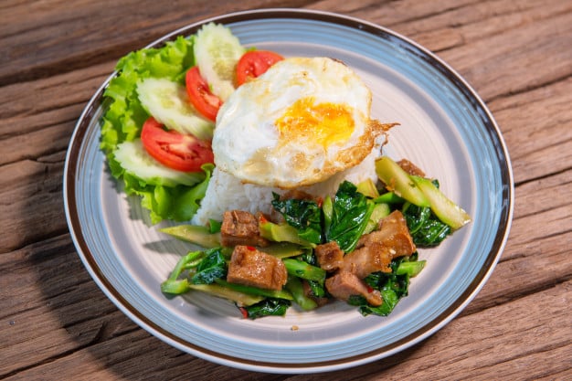 เป็นอีกเมนูที่ได้รับความนิยมอันดับต้น ๆ เช่นเดียวกัน ซึ่งจุดเด่นอยู่ที่หมูกรอบผัดกับเต้าเจี้ยว และมีความเผ็ดของพริก ทำให้กินง่าย แถมยังได้สารอาหารครบถ้วนทั้งเนื้อสัตว์ ทั้งผัก ทั้งข้าว และถ้าอยากเพิ่มความอิ่ม อร่อยขึ้นอีก ก็ให้โปะไข่ดาวเพิ่มเข้าไปค่ะ