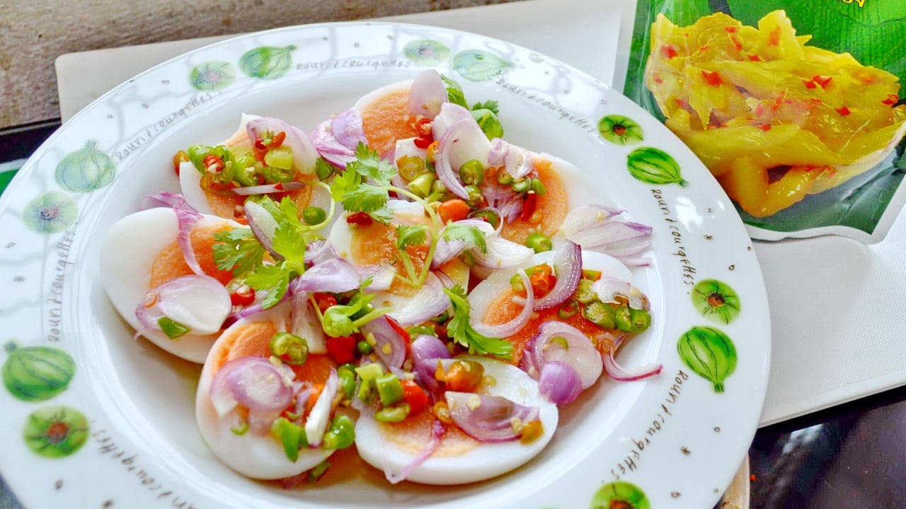 เชื่อว่าไข่ เป็นสิ่งที่ทุกบ้านจะต้องมีติดตู้เย็นไว้ เพราะว่ายิ่งในช่วงสิ้นเดือนเรามักจะทานไข่กันบ่อย ๆ ไม่ว่าจะเป็น ไข่ต้ม ไข่เจียว ไข่ดาว ไข่ตุ๋น ซึ่งอาจจะรู้สึกอยากลองทานอะไรใหม่ ๆ ที่ยังต้องใช้ไข่เป็นวัตถุดิบหลักอยู่ ดังนั้นเมนูยำไข่ต้มยางมะตูม จึงเป็นเมนูที่ทำให้ได้รสชาติแปลกใหม่ไปจากเมนูไข่ธรรมดา ๆ ที่เคยทำทาน ทานคู่กับข้าวสวยร้อน ๆ รับรองฟินแน่นอนค่ะ