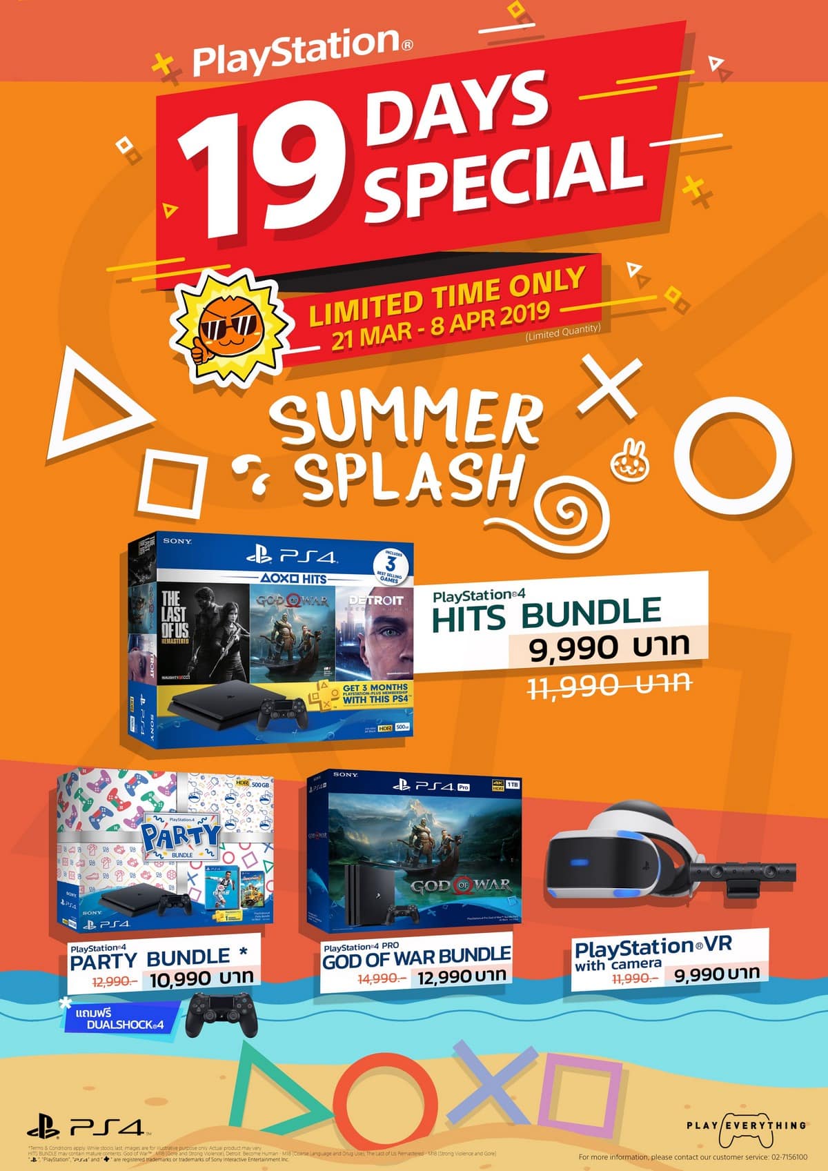 แคมเปญ “19 Days Special” เริ่มตั้งแต่วันพฤหัสบดีที่ 21 มีนาคม – วันจันทร์ที่ 8 เมษายน 2562 สามารถซื้อผลิตภัณฑ์ต่างๆ ของ PlayStation ตามรายละเอียดด้านล่างในราคาสุดพิเศษจากร้านตัวแทนจำหน่าย PlayStation หรือจะเป็นที่ Sony Store, Sony Center, Banana IT, .Life, PowerBuy และ PowerMall
