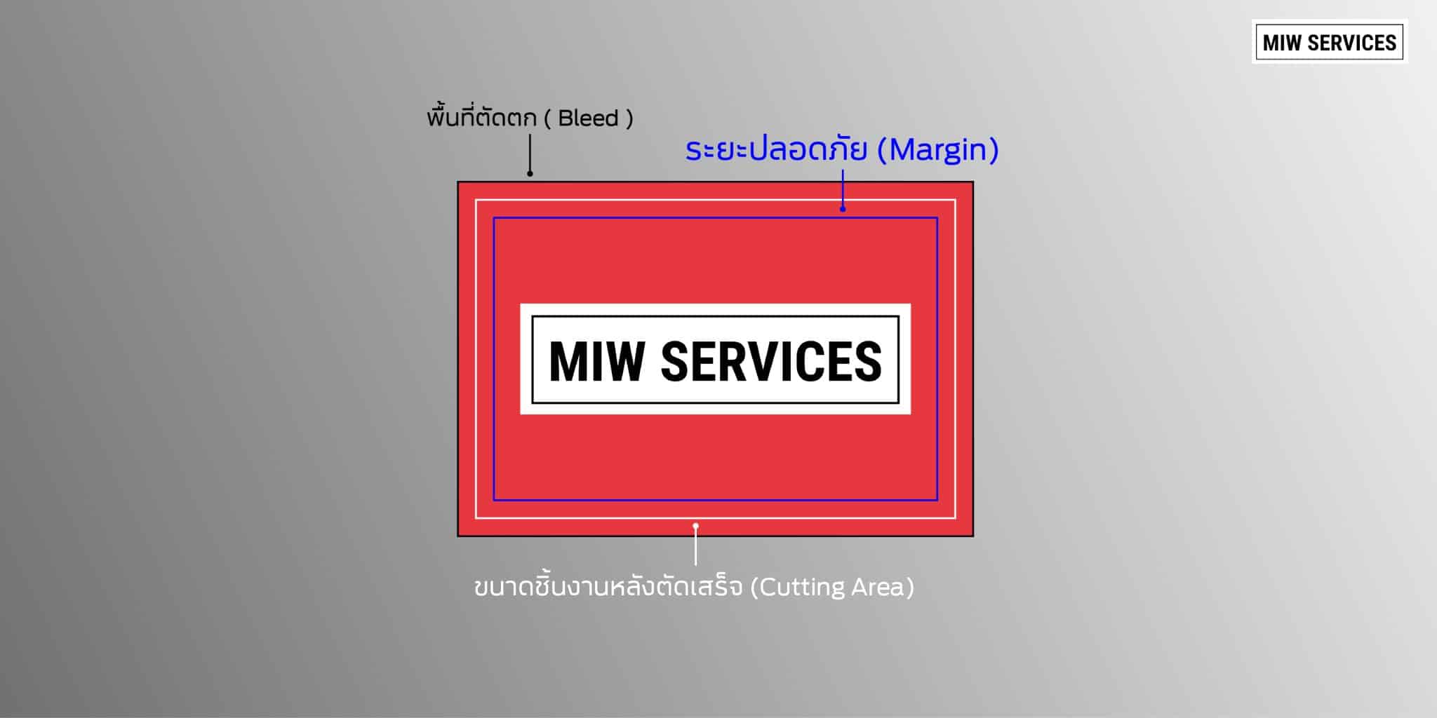 Safety Margin (ระยะปลอดภัย) พื้นที่ด้านในที่ห่างจากขอบตัดเข้ามาประมาณ 3 มม. เป็นพื้นที่สำหรับวางข้อความ โลโก้ หรือเนื้อหาสำคัญ เพื่อป้องกันไม่ให้ข้อมูลถูกตัดขาดหายไปในขั้นตอนการตัดเจียน