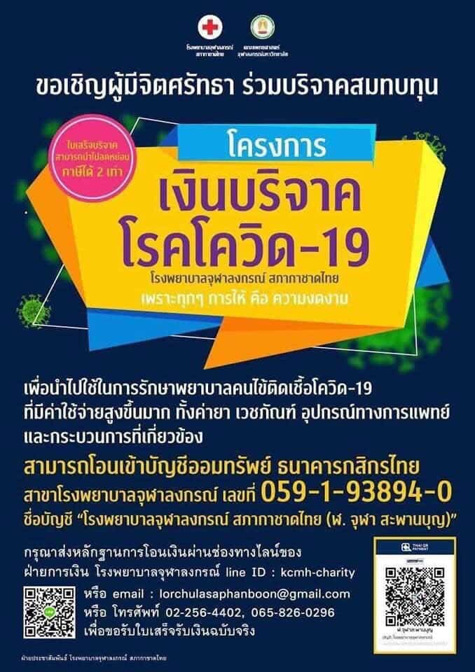 - ธนาคารกสิกรไทย ชื่อบัญชี “โรงพยาบาลจุฬาลงกรณ์ สภากาชาดไทย (ฬ.จุฬา สะพานบุญ)”