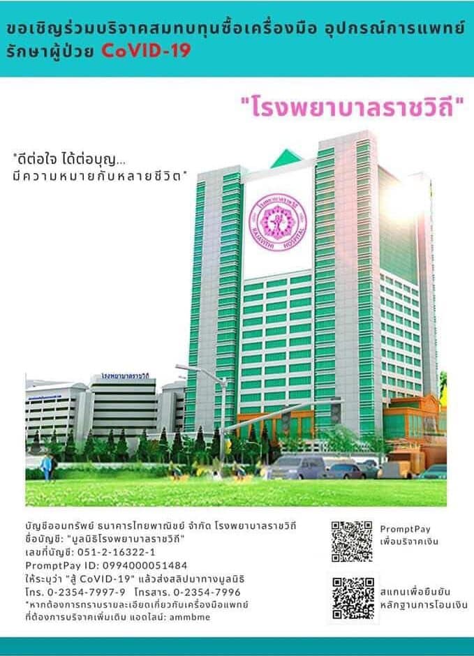 เลขที่บัญชี 051-2-16322-1 - โอนผ่าน พร้อมเพย์ 0994000051484 โดยระบุว่า “สู้ CoVID-19” พร้อมส่งหลักฐานการโอนมาที่ Fax: 0-2354-7996