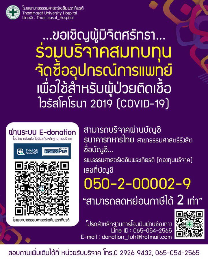 - ธนาคารทหารไทยชื่อบัญชี “รพ.ธรรมศาสตร์เฉลิมพระเกียรติ (กองทุนบริจาค)”