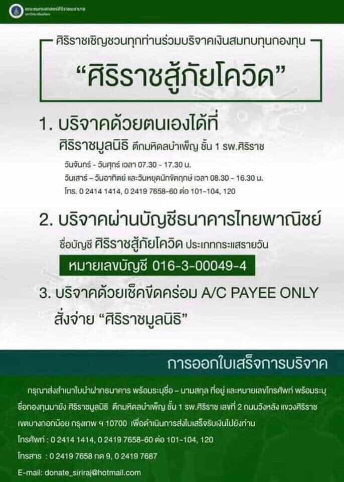 วันเสาร์ – อาทิตย์ วันหยุดนักขัตฤกษ์ เวลา 08.30 – 16.30 น. - ธนาคารไทยพาณิชย์ ชื่อบัญชี “ศิริราชสู้ภัยโควิด” ประเภทกระแสรายวัน
