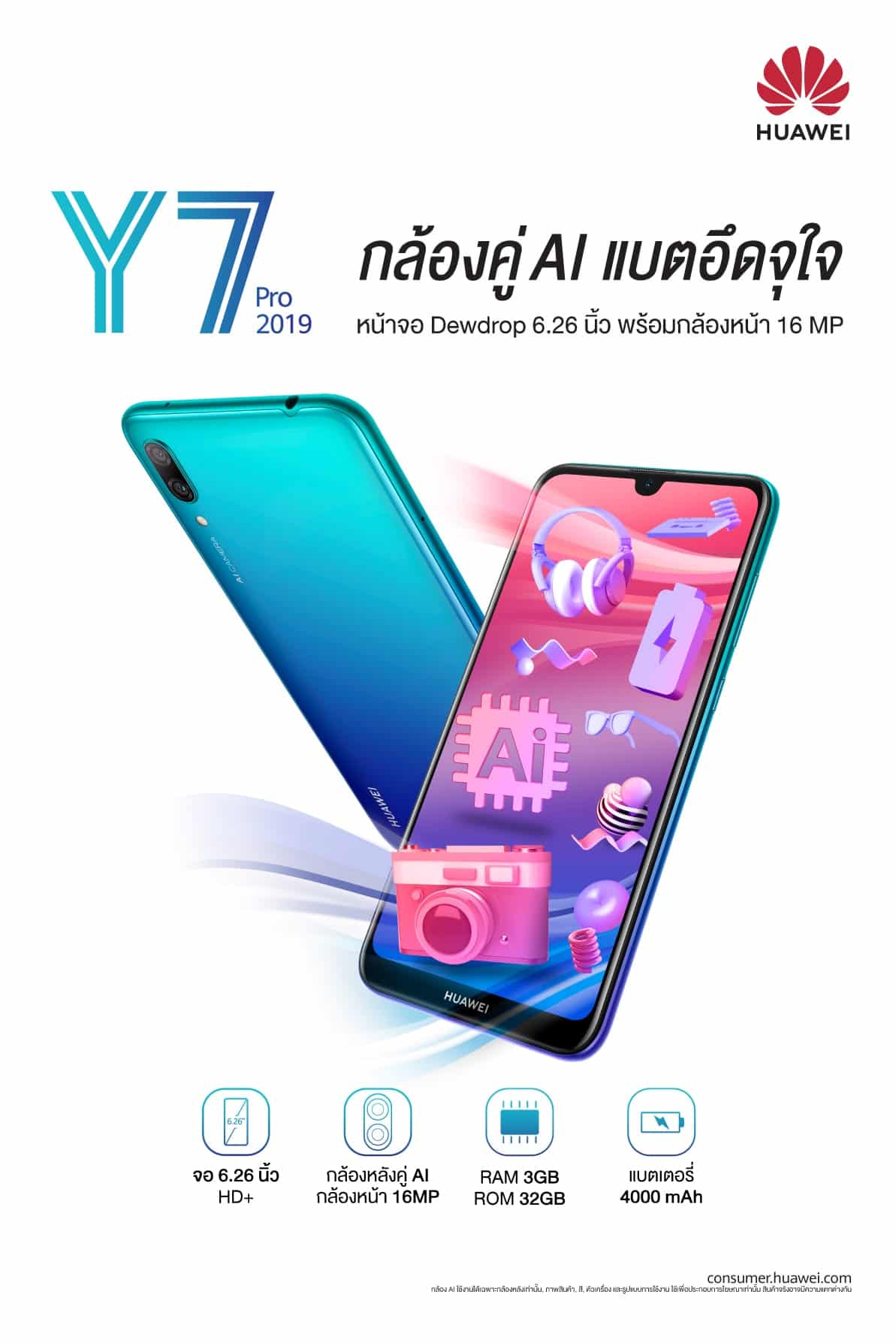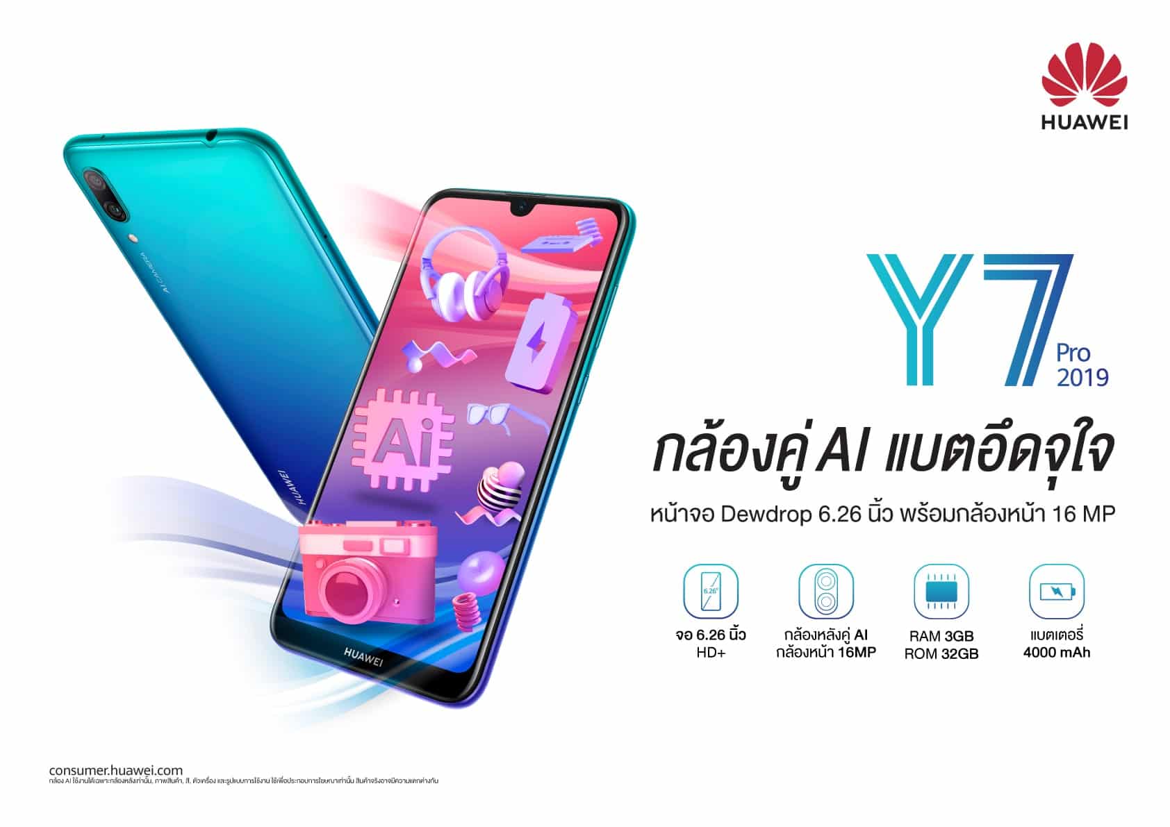 หัวเว่ยวางขาย HUAWEI Y7 Pro 2019 รุ่นใหม่ล่าสุดที่ต่อยอดมาจาก Y7 Pro 2018 จัดเต็มทั้งหน้าจอไร้ขอบแบบหยดน้ำ กล้องหลังคู่ AI สุดฉลาด แบตอึด เปิดขายในราคาเพียงแค่ 4,990 บาท