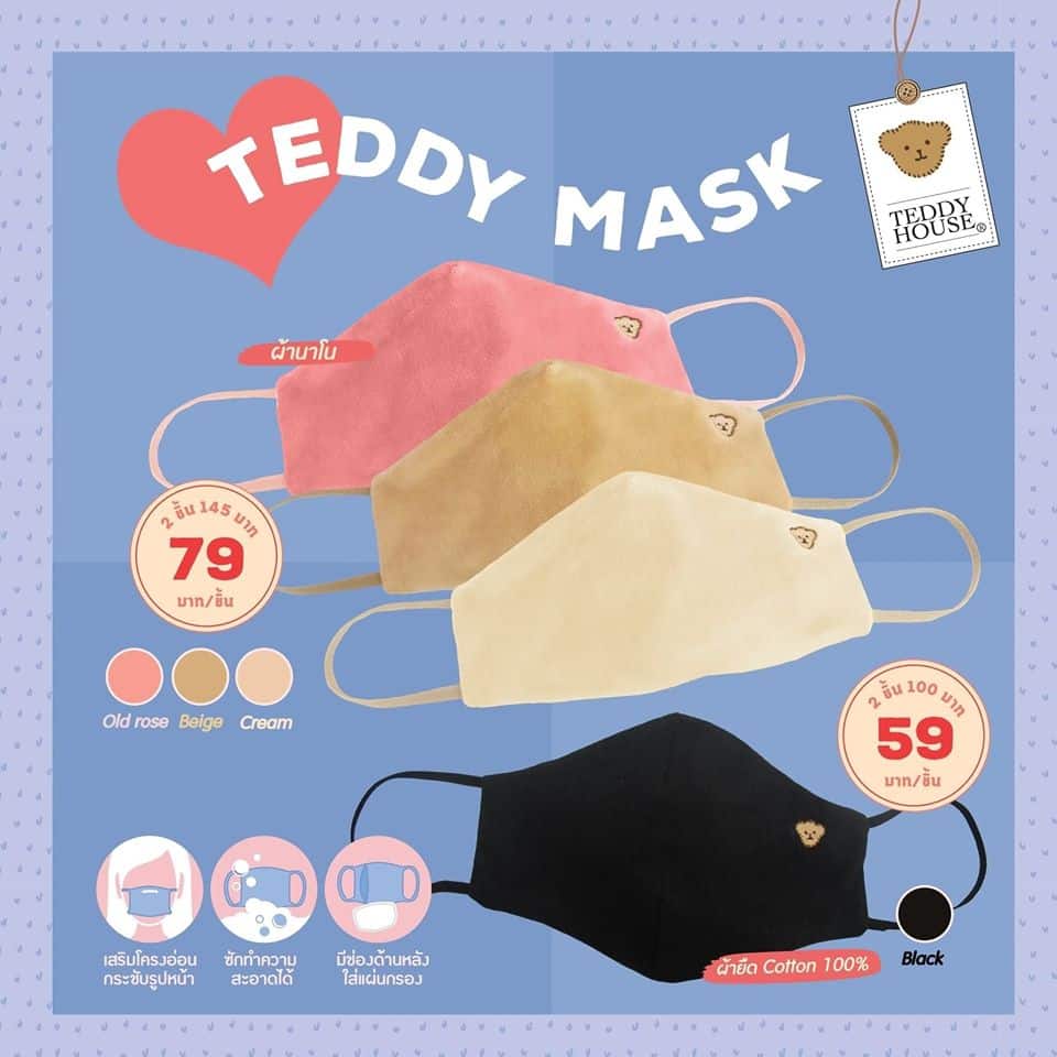 แบรนด์ที่ผลิตและจำหน่ายตุ๊กตาหมี Teddy House ได้ผลิตหน้ากากผ้า 2 แบบ คือ ผ้ายืดแบบสกรีน ราคา 59 บาท ซื้อ 2 ชิ้น 100 บาท และ ผ้านาโนแบบปัก ราคา 79 บาท ซื้อ 2 ชิ้น 145 บาท มี 2 ขนาดให้เลือก ขนาดผู้ใหญ่และขนาดเด็ก ตัวหน้ากากเสริมโครงอ่อนส่วนบนเพื่อกระชับสันจมูกให้เข้ากับรูปหน้า ทำจากผ้าเนื้อดี ยืดหยุ่น เบาสบาย ระบายอากาศได้ดี มีช่องด้านหลังใส่แผ่นกรองและสามารถซักทำความสะอาดได้