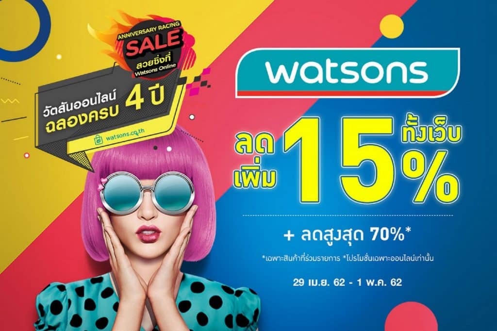 วัตสันออนไลน์ฉลองครบรอบ 4 ปี จัดโปรโมชั่น “Anniversary Racing” โดนใจสายช้อปออนไลน์! เมื่อช้อปสินค้าผ่านวัตสันออนไลน์ (ผ่านเว็บไซต์หรือแอพพลิเคชั่น) รับส่วนลดพิเศษเฉพาะสินค้าที่ร่วมรายการสูงสุด 70% และลดเพิ่มทั้งเว็บอีก 15%