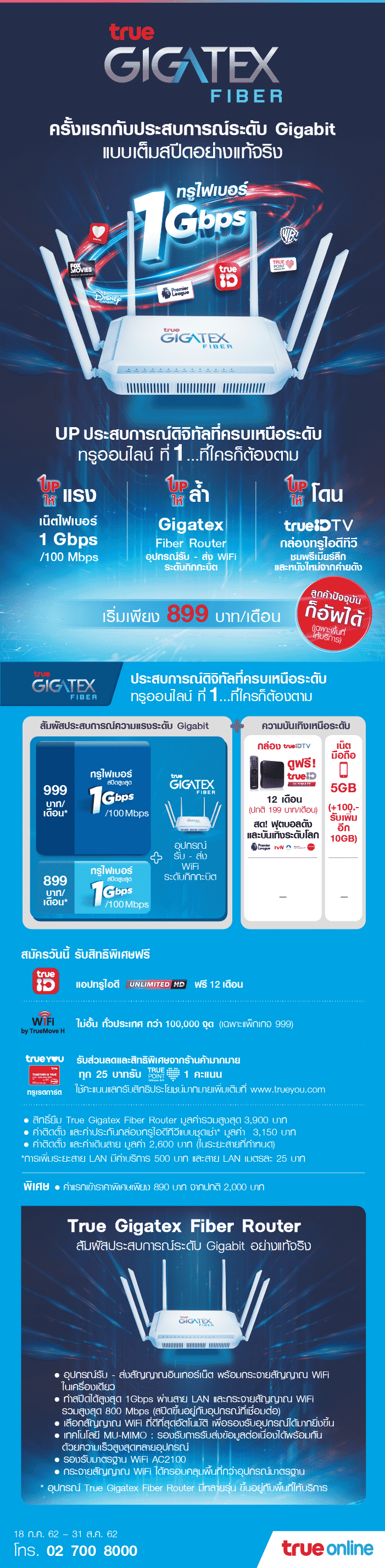 ทรูออนไลน์ ย้ำผู้นำไฟเบอร์อินเทอร์เน็ตหนึ่งเดียวในไทย สร้างปรากฏการณ์อัปชีวิตแรงเหนือระดับ ล้ำไปอีกขั้นกับประสบการณ์ระดับ Gigabit แบบเต็มสปีดอย่างแท้จริง ด้วยเทคโนโลยีล่าสุด Gigatex Fiber Router ที่ให้ความแรงเน็ตบ้านไฟเบอร์ 1 Gbps รายแรกและรายเดียว ไม่ต้องซื้ออุปกรณ์เสริม บนโครงข่ายทรูไฟเบอร์ที่ครอบคลุมมากที่สุดทั่วไทย ในราคาคุ้มค่าสุดเริ่มต้นเพียง 899 บาทต่อเดือน หรือรับเพิ่มกล่อง TrueID TV สำหรับชมคอนเทนต์ระดับโลก ทั้งพรีเมียร์ลีกและหนังจากค่ายดัง เพียง 999 บาทต่อเดือน